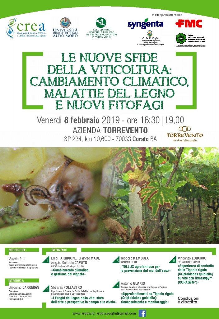 L'8 febbraio, presso l'azienda Torrevento di Corato (BA), si terrà il convegno "Le nuove sfide delle viticoltura: cambiamento climatico, malattie del legno e nuovi fitofagi".