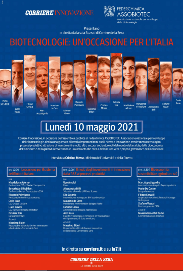 Stefano Vaccari, Direttore del CREA, parteciperà all'incontro organizzato da Corriere Innovazione in occasione dell'assemblea annuale di Federchimica Assobietec, Associazione Nazionale per lo Sviluppo delle Biotecnologie, che si svolgerà il 10 maggio a partire dalle ore 10:00.