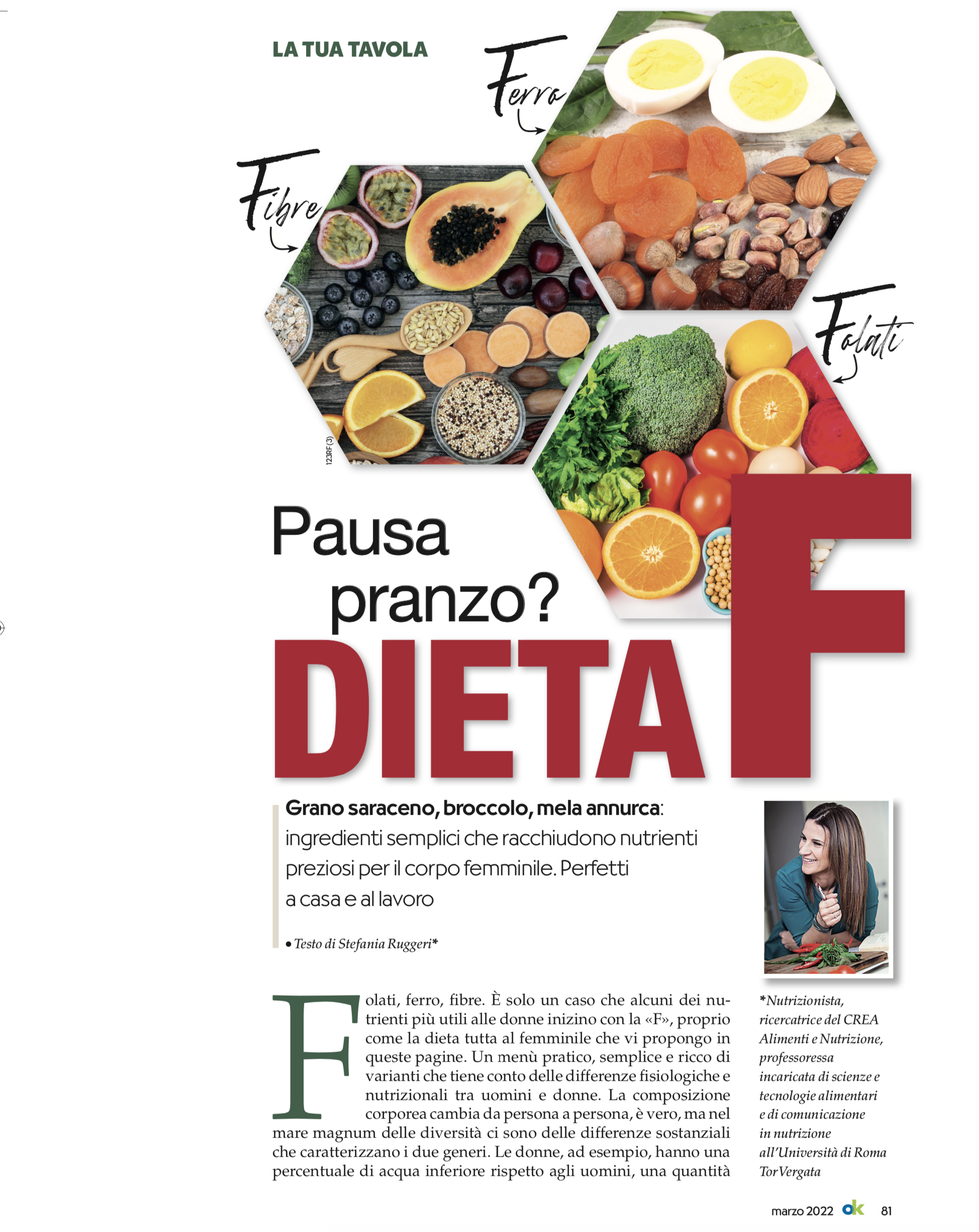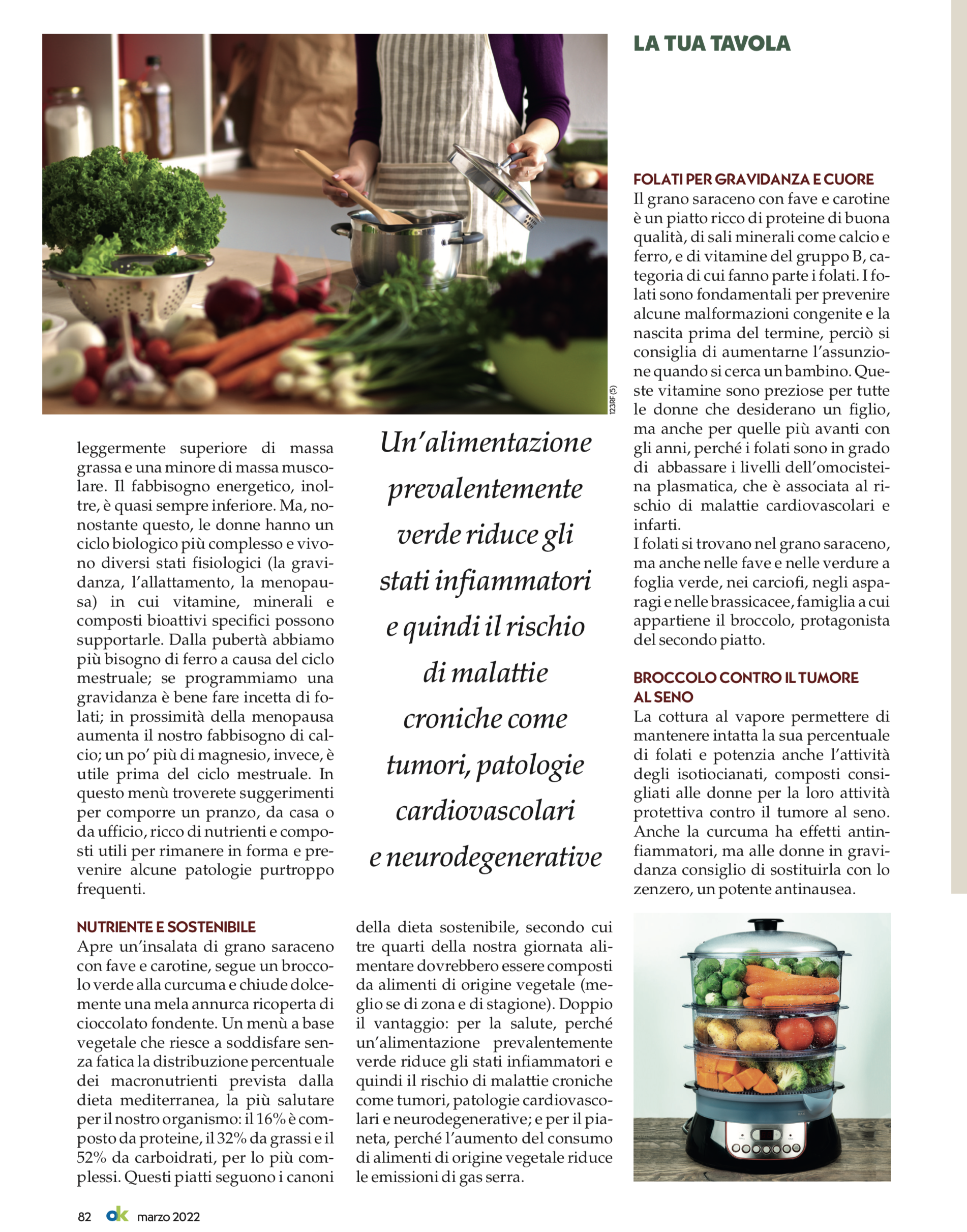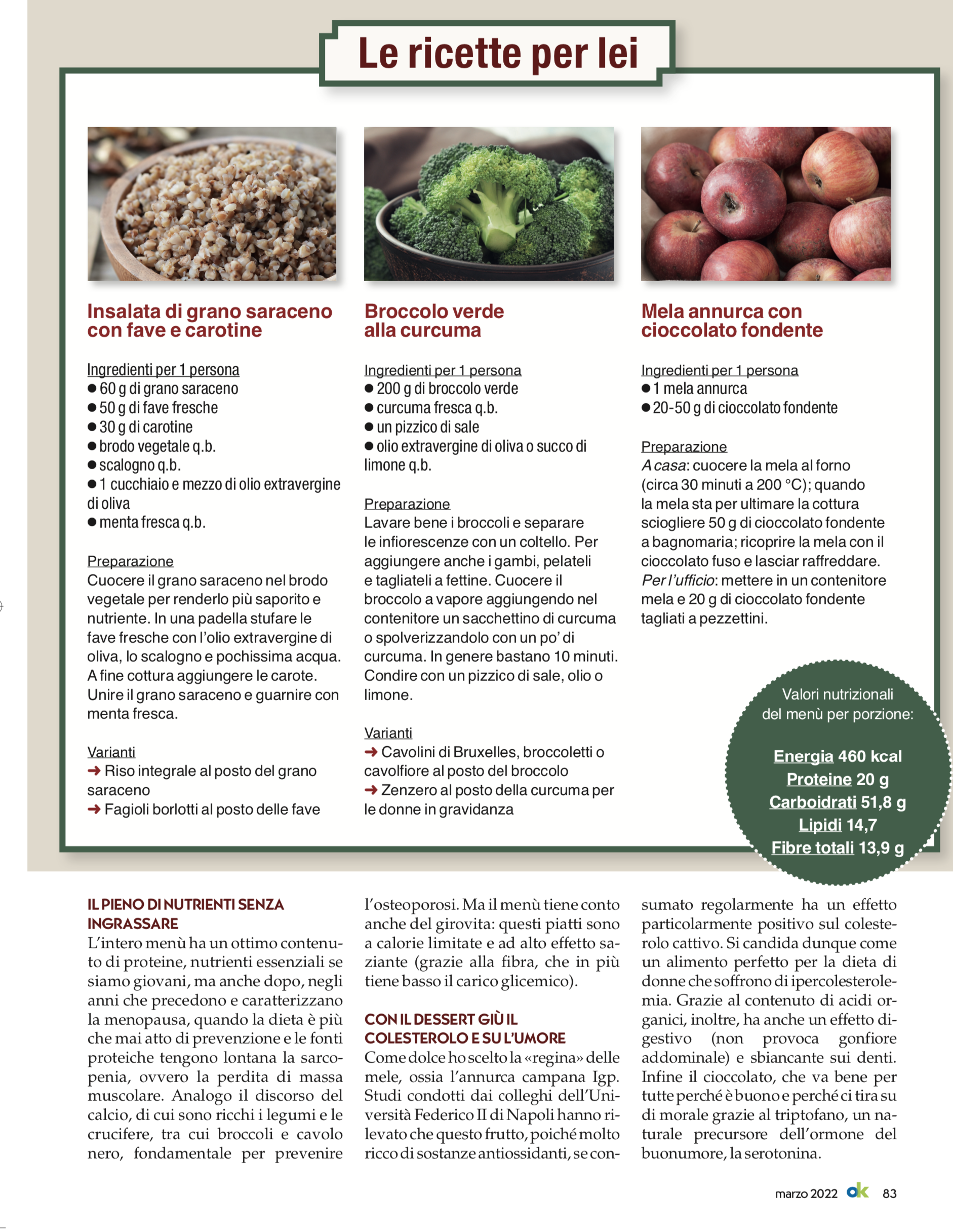 Stefania Ruggeri, ricercatrice del CREA Alimenti e Nutrizione, ha scritto un articolo sulla rivista "OK Salute e Benessere", in cui illustra 3 ricette a base vegetale, perfette per le donne di tutte le età: un'insalata di grano saraceno, un broccolo verde alla curcuma e una mela annurca al cioccolato fondente, un menù ricco di calcio, fibre, proteine, sali minerali e vitamine del gruppo B. Tutti cibi con proprietà antiossidanti e antinfiammatorie, altamente sazianti e al contempo a basso apporto calorico e a limitato impatto ambientale, indicati per prevenire il rischio di contrarre malattie croniche, quali tumori, patologie cardiovascolari e neurodegenerative.