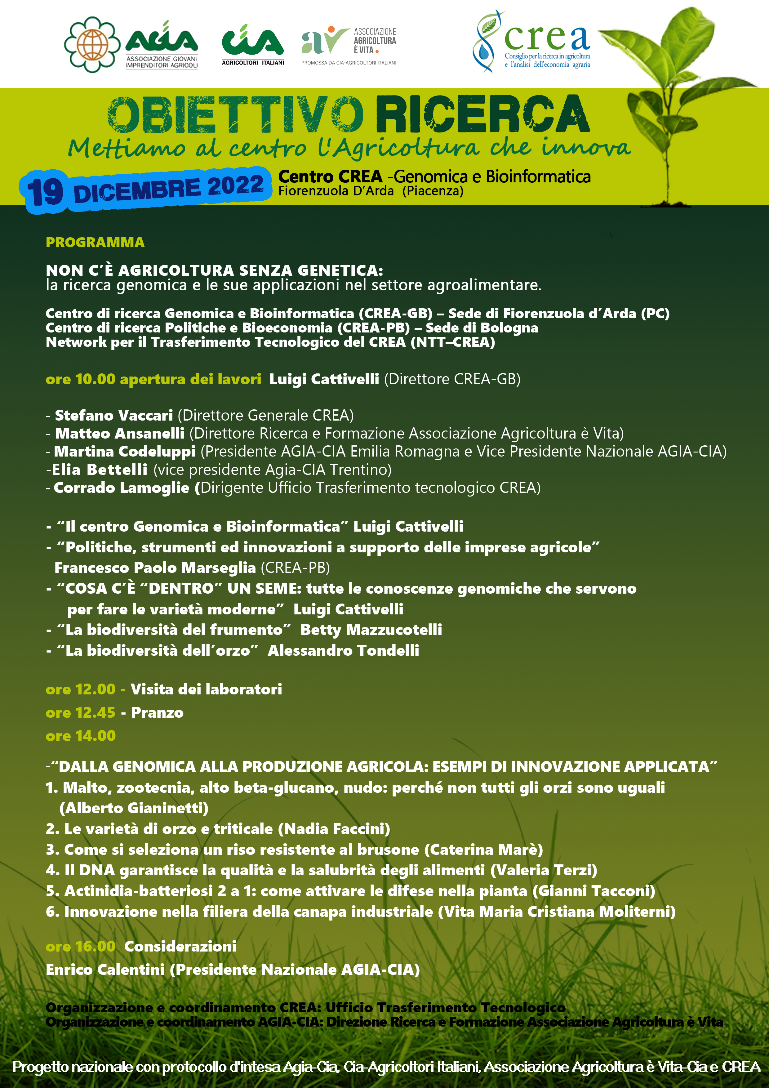 "Non c’è agricoltura senza genetica: la ricerca genomica e le sue applicazioni nel settore agroalimentare". Questo il titolo del terzo incontro tra imprenditori e ricercatori del percorso delineato dal Protocollo d’Intesa tra CREA, CIA, AGIA e Agricoltura e Vita, che si terrà il 19 dicembre presso il CREA Genomica e Bioinformatica di Fiorenzuola d’Arda (PC) con l'obiettivo di esplorare insieme le nuove frontiere del miglioramento genetico per ottenere moderne varietà vegetali.