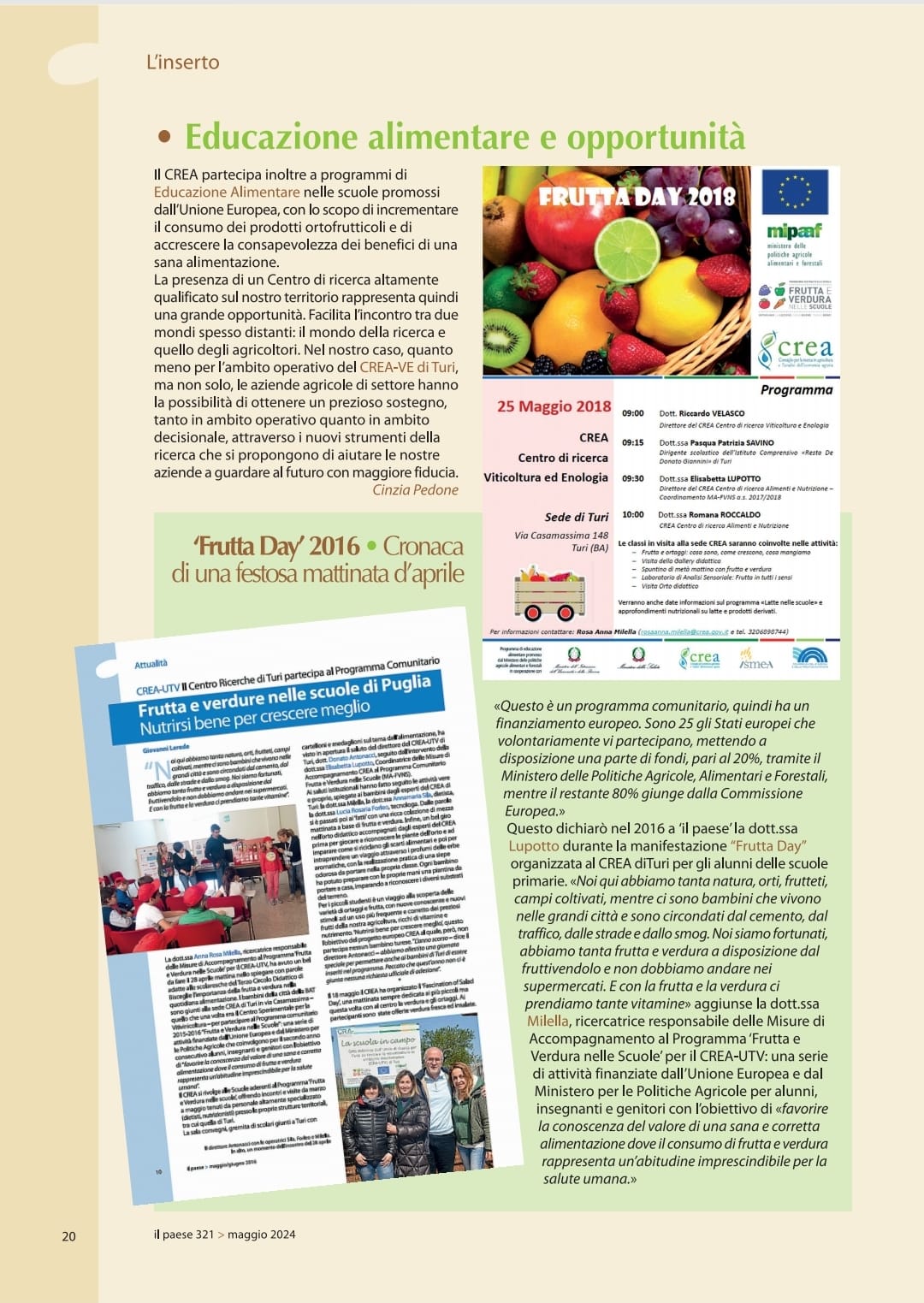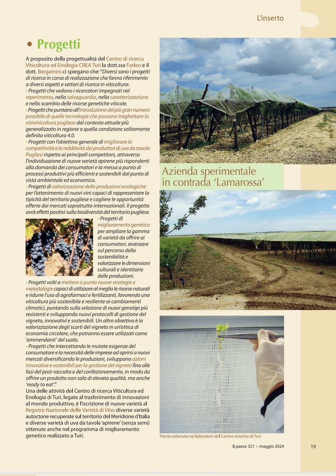 Il CREA Viticoltura ed Enologia può annoverare una consolidata esperienza sul territorio, storicamente vocato come quello della Regione Puglia, grazie alle partecipazioni al Consorzio di Gioia DOC e al Distretto del Vino di Puglia e alle collaborazioni con tutte le maggiori realtà pugliesi: dal Consorzio del Primitivo di Manduria alle cantine Due Palme, da Tormaresca (gruppo Antinori) ai programmi per il rilancio della spumantizzazione dei bianchi e dei rosati pugliesi.