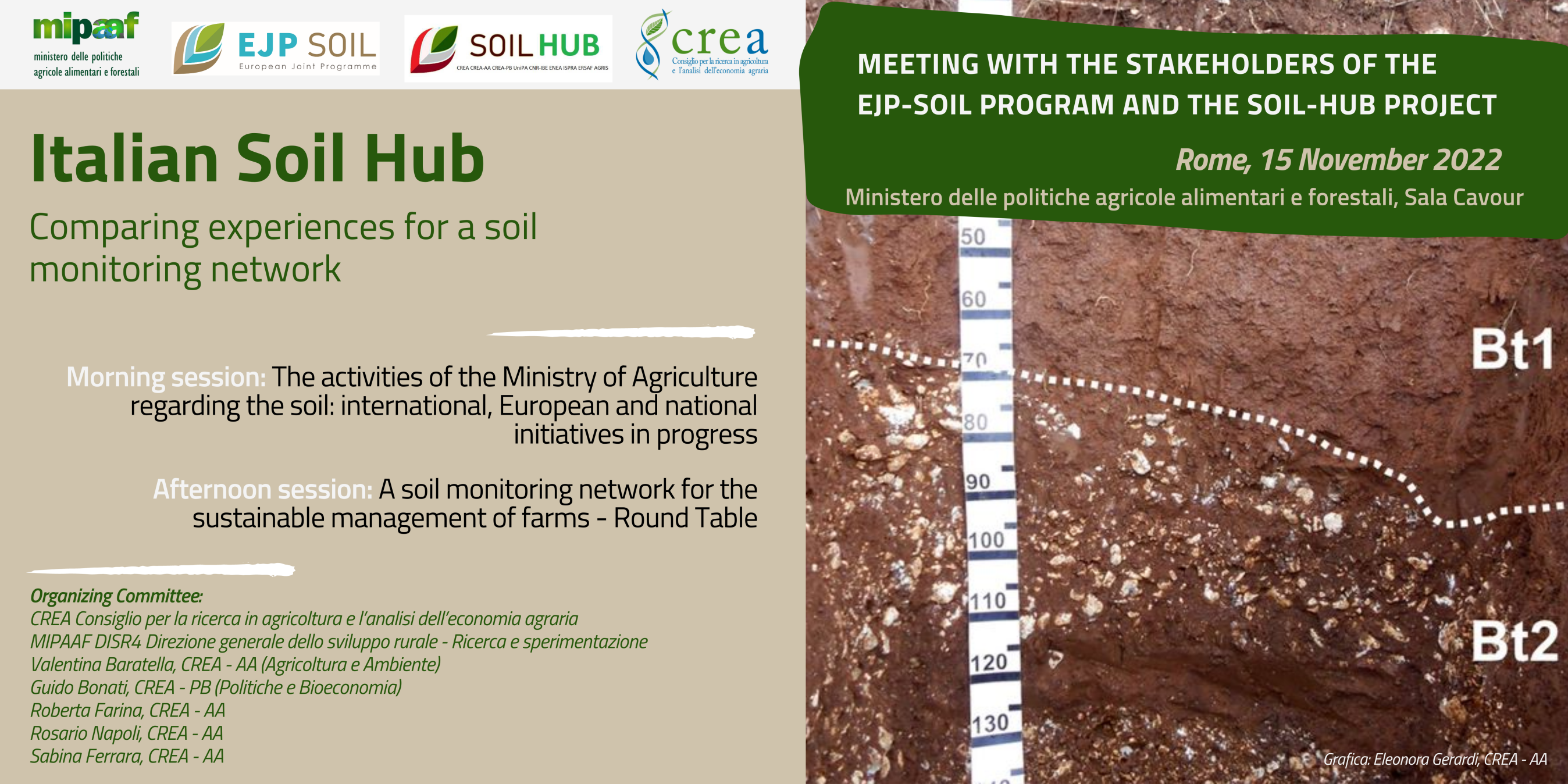 In the framework of the European Joint Program on Soil (EJP Soil) and the national Soil HUB project, CREA will coordinate the meeting “Italian Soil Hub - Comparing experiences for a soil monitoring network”, which will take place Tuesday 15 November from 09:30 to 17:00 at the Ministero delle politiche agricole alimentari e forestali.