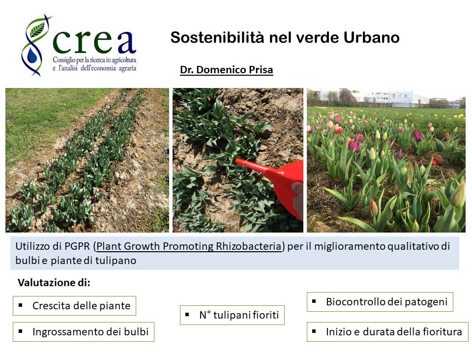 Domenico Prisa del CREA Orticoltura e Florovivaismo di Pescia, terrà una relazione sull’uso di tecniche sostenibili per la gestione del verde ornamentale, in particolare sulle sperimentazioni per valutare il miglioramento della crescita e della durata delle fioriture di tulipano tramite inoculazione di PGPR (Plant Growth Promoting Rhizobacteria).