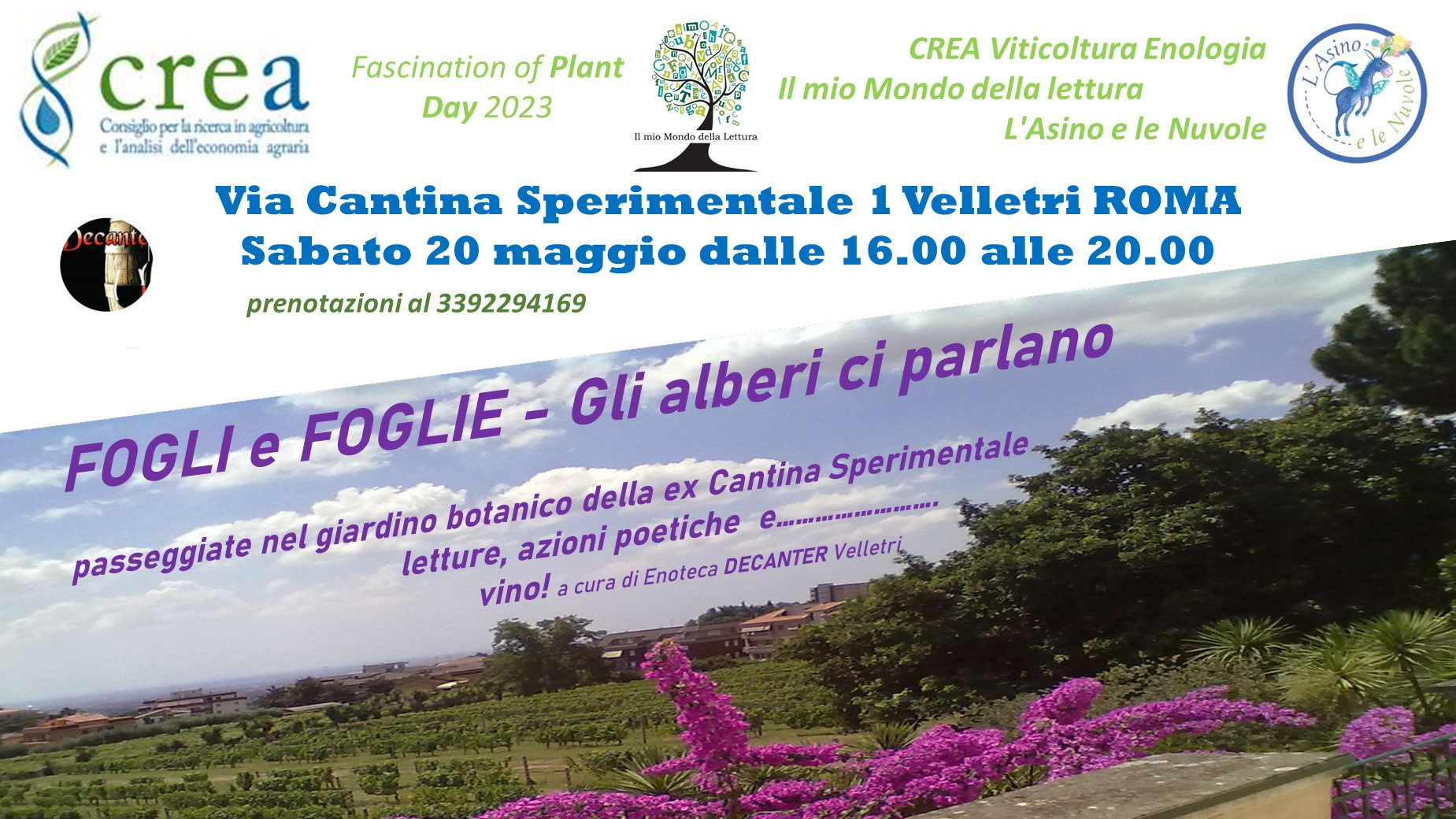 Il CREA, Centro di Ricerca Viticoltura Enologia sede di Velletri in collaborazione con le associazioni "Il Mondo della Lettura" e "L'Asino che vola" il 20 maggio,  in occasione del Fascination of Plant day 2023, apre al pubblico il suo giardino ricco di particolarità botaniche, con una visita guidata con letture di testi e poesie dedicate al mondo vegetale.  Le letture saranno curate dall’associazione “Il mio Mondo della Lettura”, che ha ideato un percorso all’interno del giardino dell’ex Cantina Sperimentale.  Contestualmente, a cura dei ricercatori del Centro, sarà illustrata la storia del sito e si parlerà di biodiversità e di domesticazione della vite. La giornata comprenderà anche una piccola degustazione di vini del territorio, in collaborazione della locale enoteca Decanter.