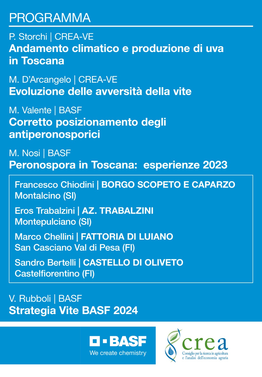 L’evento svolto in collaborazione con BASF ha lo scopo di riunire importanti realtà vitivinicole della Toscana, Agronomi ed operatori del settore allo scopo di analizzare l’anna passata mettendo in luce le buone pratiche adottate e le opportunità offerte dall’innovazione tecnologica sia per quanto riguarda l’uso di DSS in viticoltura che l’introduzione, ragionata, di nuovi prodotti per la difesa del vigneto.