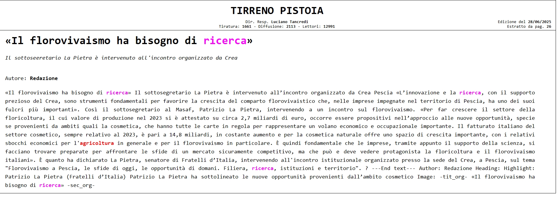 "Pescia rappresenta un laboratorio straordinario dove la ricerca del CREA reinventa una consolidata tradizione di eccellenza, coniugando innovazione e competenze, per cogliere le opportunità di un mercato globale in costante evoluzione, con l'obiettivo di creare valore d’impresa e sviluppo sostenibile su tutto il territorio”. Dichiara Andrea Rocchi, presidente CREA in occasione del workshop istituzionale Florovivaismo a Pescia: le sfide di oggi, le opportunità di domani. Filiera, Ricerca, Istituzioni e Territorio, organizzato dal CREA, legato alle sfide e alle opportunità dell'area di Pescia, con l’obiettivo di stimolare un confronto costruttivo tra i diversi attori coinvolti nello sviluppo locale.