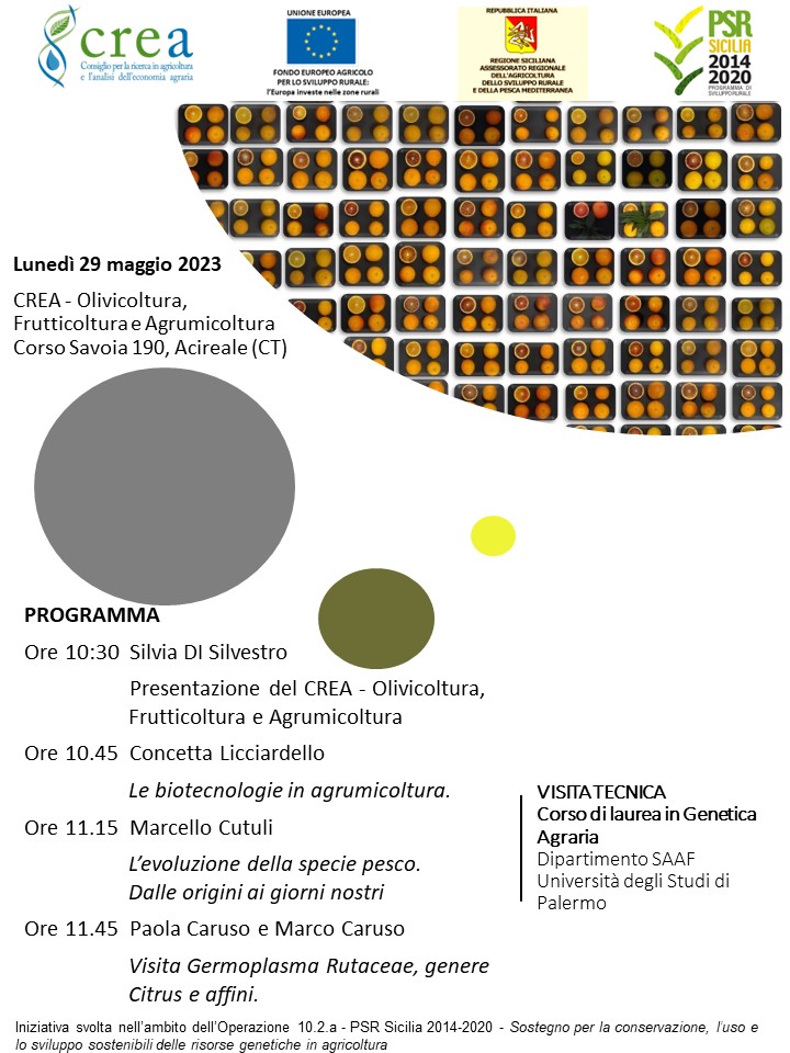 Il 29 maggio 2023 gli studenti del corso di “Genetica Agraria” del Dipartimento di Scienze Agrarie, Alimentari e Forestali dell’Università di Palermo, accompagnati dalla Prof.ssa Annalisa Marchese, saranno in visita presso la sede di Acireale del CREA-Olivicoltura, Frutticoltura e Agrumicoltura, durante la quale verranno illustrate le principali ricerche svolte presso il Centro con un focus sugli aspetti genetici e la salvaguardia della biodiversità. Saranno trattati i temi sulla caratterizzazione e conservazione del germoplasma di agrumi e drupacee, la caratterizzazione molecolare, l’identificazione di geni agronomicamente utili, l’utilizzo delle tecniche OGM e genome editing (CRISPR-Cas9) anche attraverso la presentazione di alcuni casi studio. Inoltre, gli studenti verranno accompagnati a visitare i campi sperimentali e la collezione di germoplasma di specie di Rutaceae appartenenti al genere Citrus e generi affini.