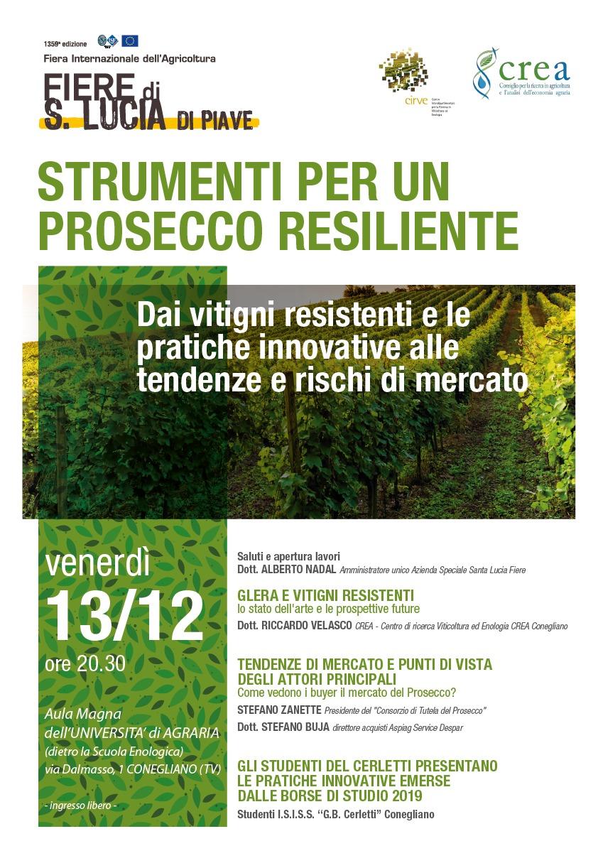Riccardo Velasco, Direttore del CREA Viticoltura ed Enologia, interviene al convegno Strumenti per un prosecco resiliente, con un contributo dal titolo Glera e vitigni resistenti. Lo stato dell'arte e le prospettive future, in programma per il 13 dicembre dalle ore 20,30 presso l'Aula Magna dell'Università di Agraria, Via Dalmasso, 1 Conegliano (TV).